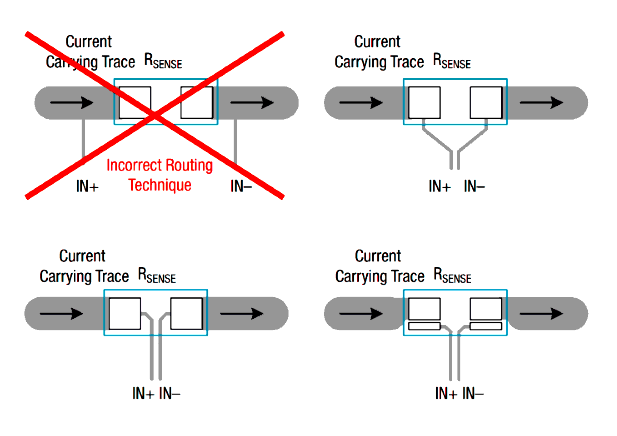 Исследования показывают, что сопротивление припоя между контактной площадкой шунта и дорожкой платы может составлять от 10 до 100 мкОм. Для шунта номиналом 1 мОм такая добавка вносит погрешность до 10%, что недопустимо для систем мониторинга энергии. Применение специализированных посадочных мест с выделенными выводами (правый нижний пример на иллюстрации) позволяет достичь точности 0.1% и выше.