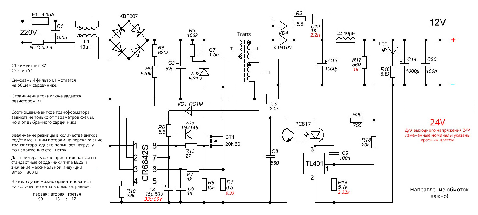C3Конденсатор, шунтирующий межобмоточную ёмкость. В идеале должен быть Y-типа, либо же должен иметь большой запас (15-20 раз) по рабочему (сетевому!) напряжению. Служит для уменьшения помех. Номинал зависит от параметров трансформатора, делать слишком большим нежелательно.